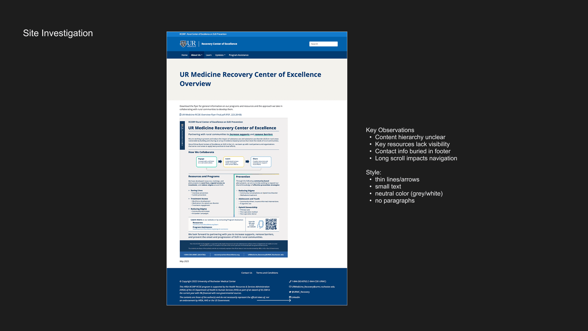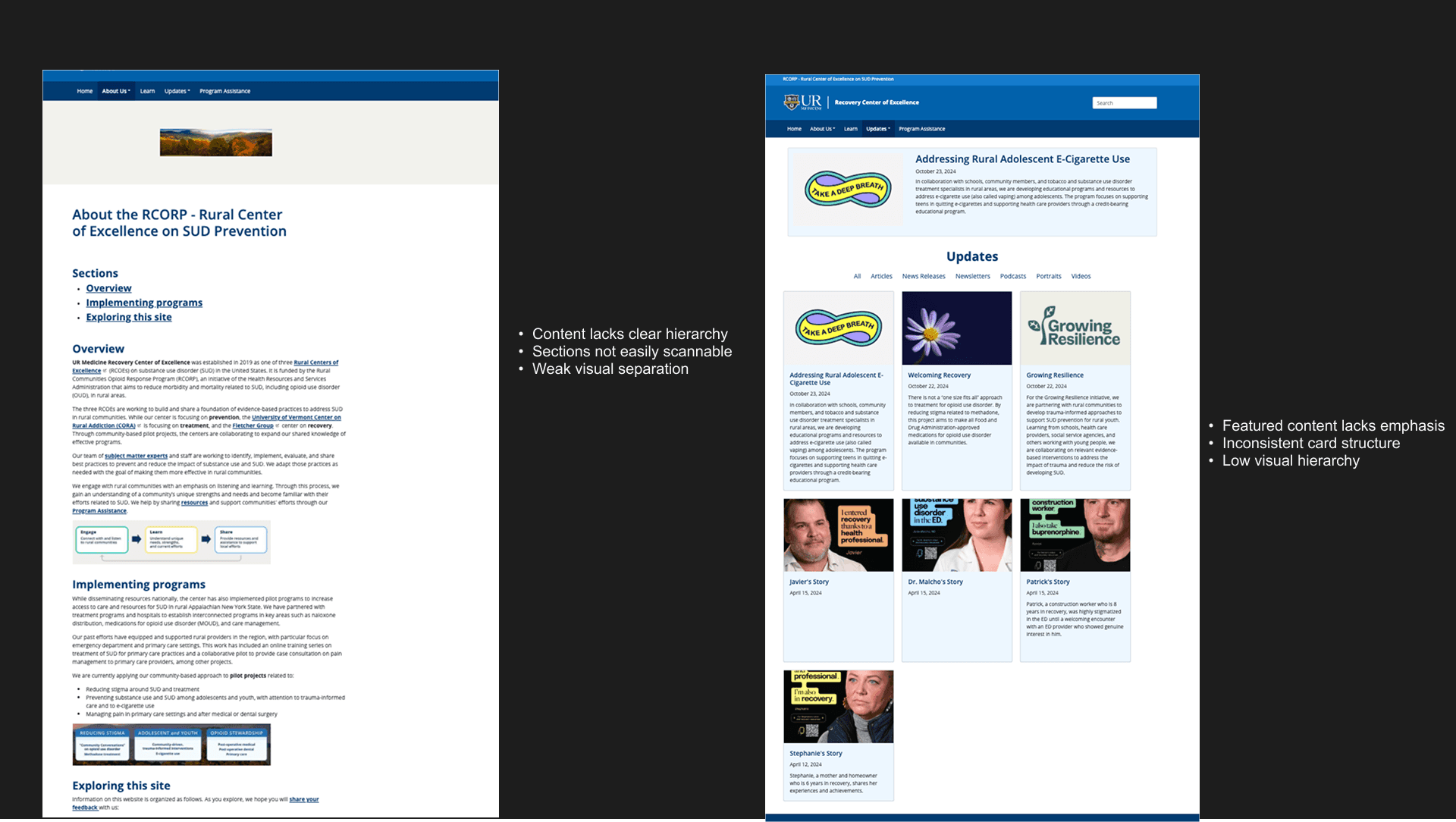 Redesigned a large-scale healthcare platform for the University of Rochester Medical Centerβs Recovery Center of Excellence, with a focus on improving accessibility, simplifying navigation, and making recovery resources easier to find and understand.